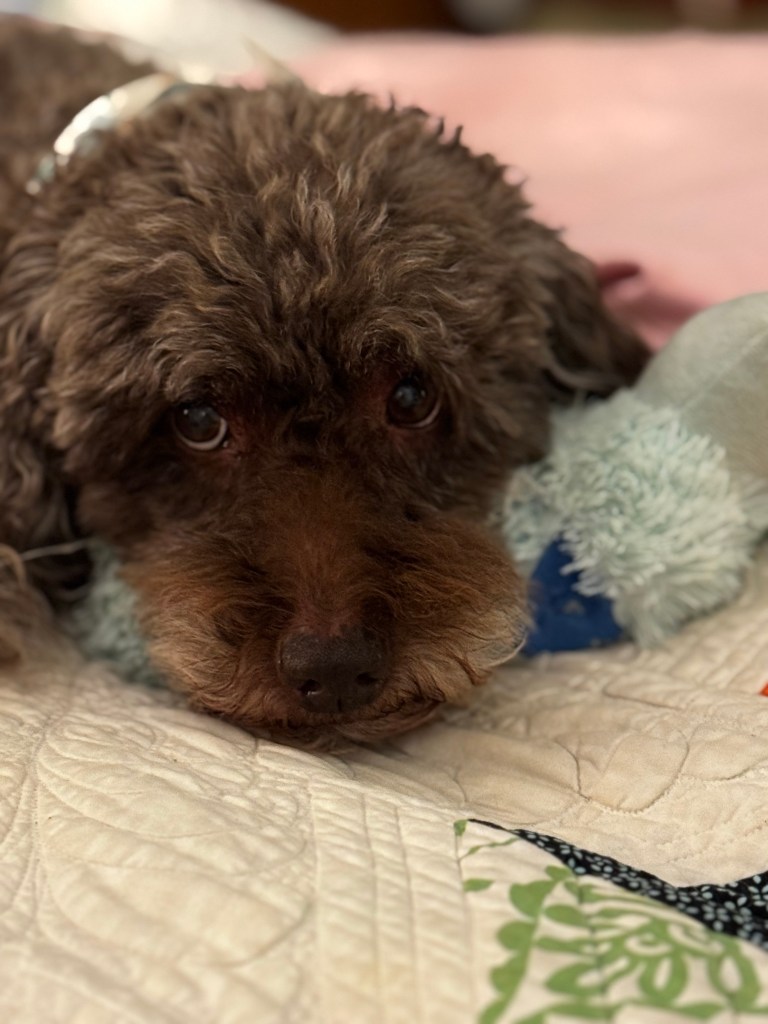 Her bed blue dog makes the perfect pillow. She loving it snuggles with it when she isn’t snuggling with us. Why she likes blue? We will never know, but blue is her color of choice. Don’t tell me dogs can’t see colors because Shay certainly can.
