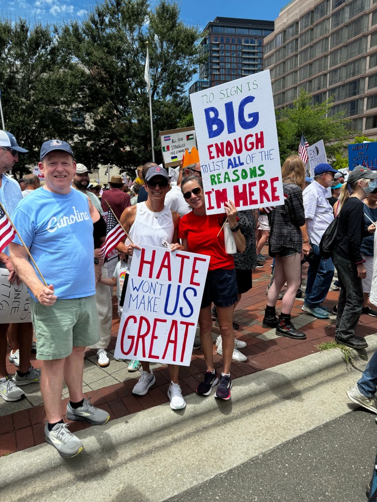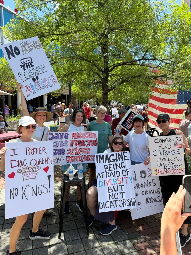 Then she invited me to our friend Michelle’s house to make signs before we went to the Durham NO KINGS protest. We didn’t have a lot of time, but we made signs and went downtown. As we walked to CCB Plaza Amy said, “I hope we have like 1,000 People.”