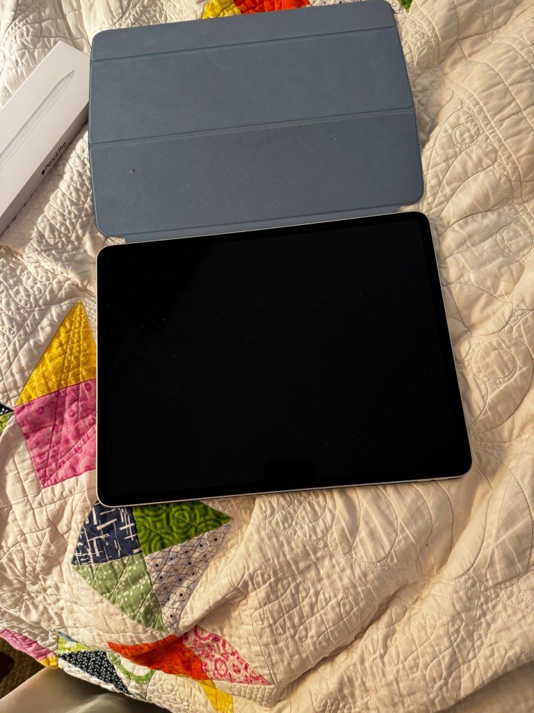 Now comes the pain in the neck of learning all the things this iPad can do that my old one couldn’t. I never actually learn all the features. I am lucky if I can type. I do not like the case and keyboard. I am able to type just fine on the screen. Russ was worried that the bigger screen would mean I would have Trouble typing. So far the only real issue is the period is one key over and I keep typing the backslash. I’ll get used to it.