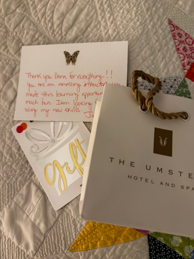 Then one of my cute students in my beyond beginner classes gave me an envelope before class ended. I opened it at home and read her sweet note and found a gift card along with it.