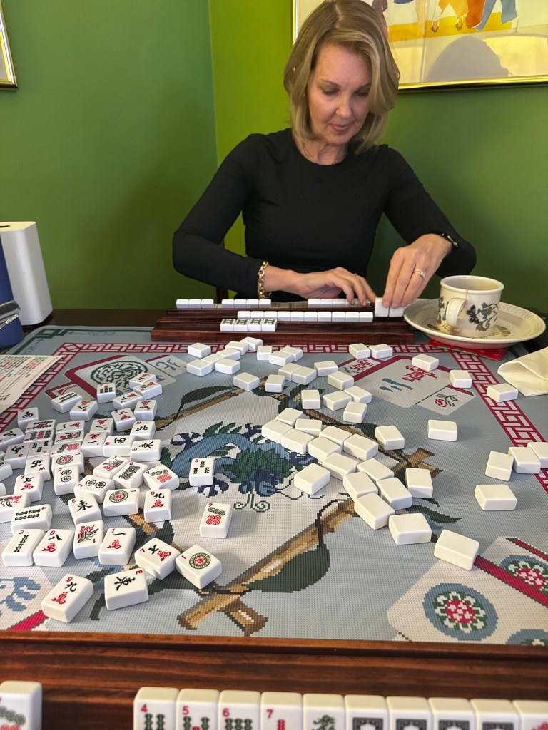 When Suzanne got up we went right to playing Siamese Mah Jongg. It was quite exciting that the card came yesterday, so we had two good days of playing lots of hands. I started my analysis. So far I have played about 150 hands of the 1,000 I need to get data for new card class.