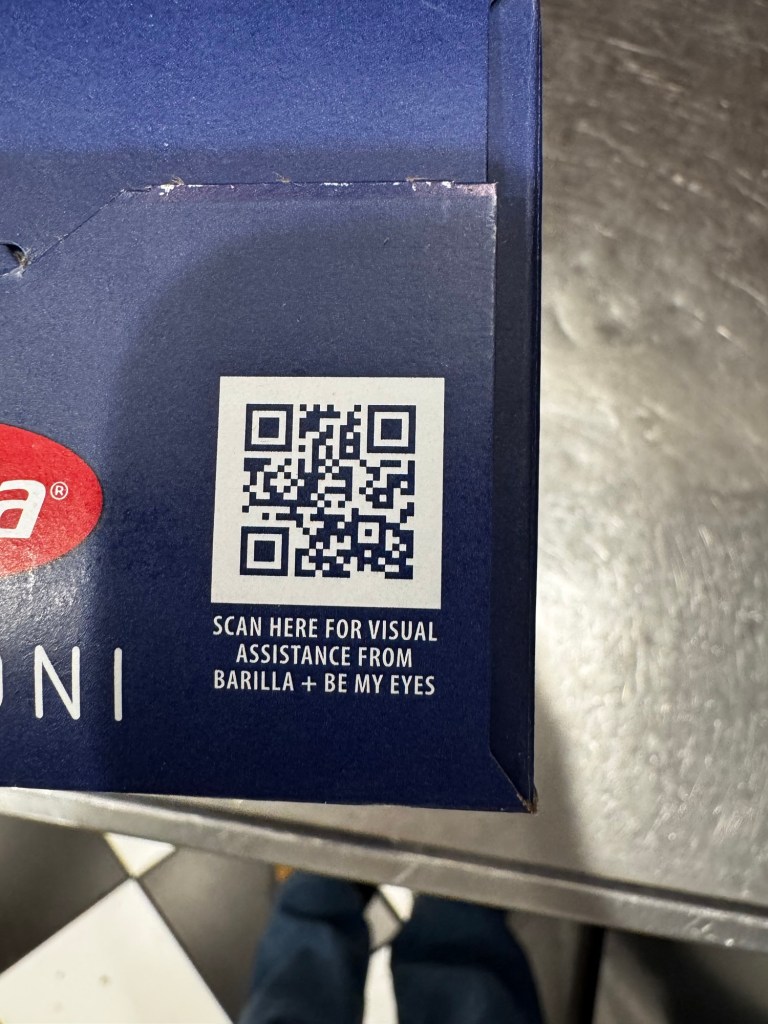 Posted: March 29, 2026 Filed under: Uncategorized Leave a commentRuss was making himself pasta for dinner. I was having a non-pasta dinner so I was not involved in the cooking. He showed me the Barilla Box. He said, “look at this.” On the top of the box was a tiny QR code. Then below it, in mice type were these words, “Scan here for visual assistance from Barilla + be my eyes.”