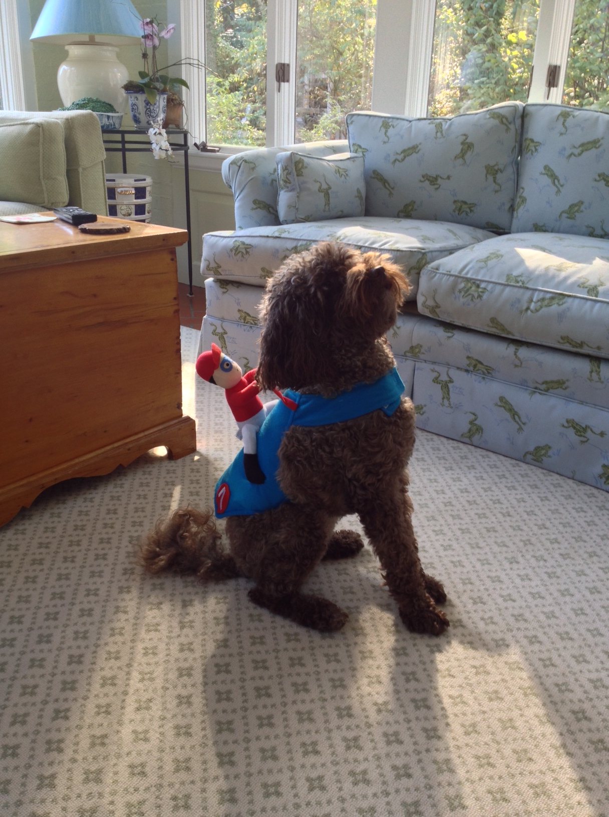 Then we spotted the perfect outfit for both Carter and Shay. A jockey and saddle turning Shay into the horse he is riding on. At first wearing Shay kept looking behind her to see what monkey was on her back, but then she settled into her role as steed. We think she is going to wait until our backs are turned and then grab that little man off her back and rip him to shreds looking for his squeaker. That will be no problem since the whole outfit only cost $2.97.