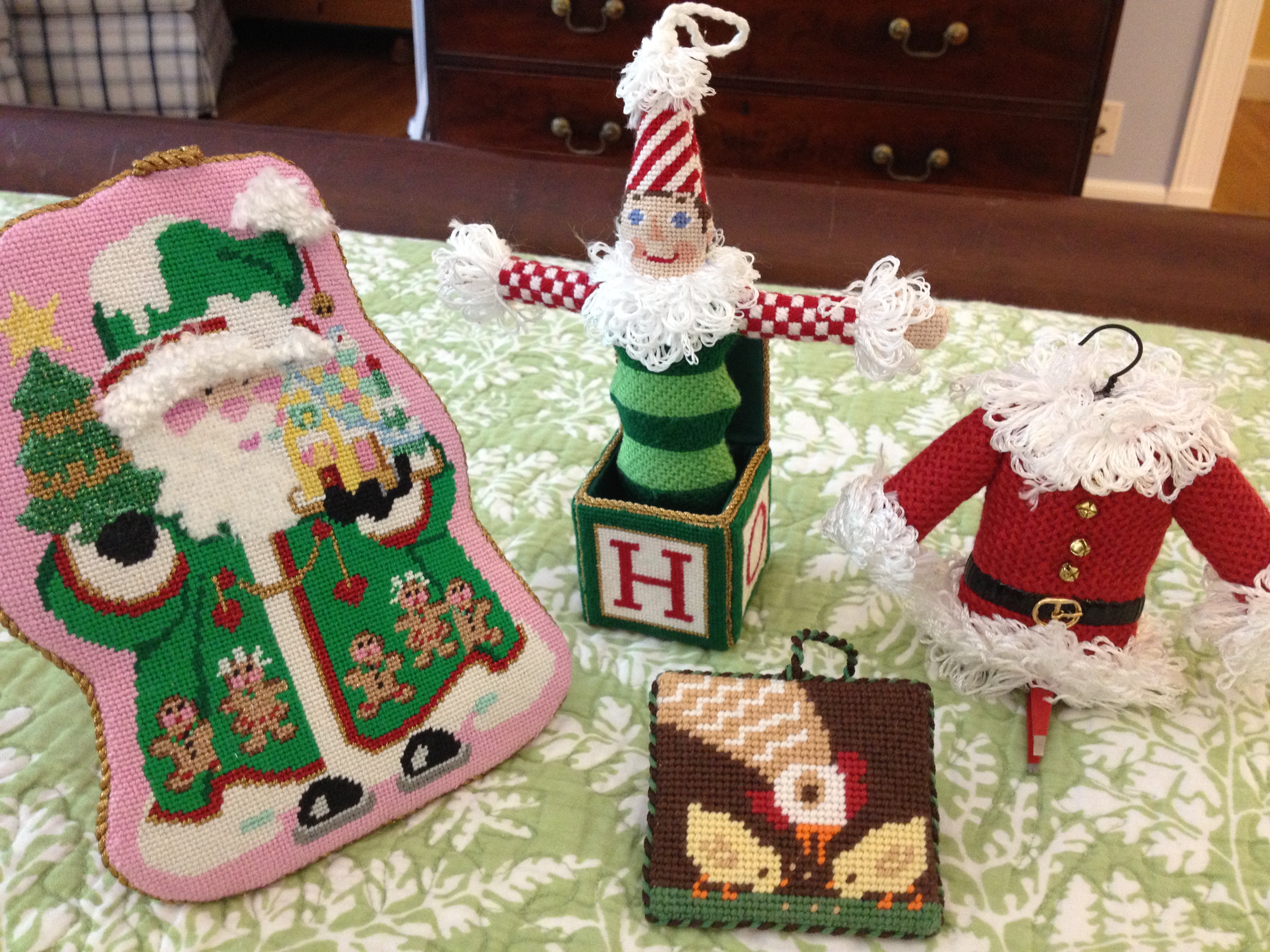 Posted: August 13, 2013 Filed under: Diet- comedy | Tags: chapel hill needlepoint, Nancy McGuffin, needle point, treadmill, working out 3 CommentsToday was a red-letter day in my small world. I got back four ornaments from the fabricators. Not just any ornaments, but two were three-dimensional ones and one was a fairly big Santa. The HOHO Jack-in-the-box was probably the biggest ornament I have made so far so seeing it finished and ready to go on the Christmas tree was very exciting to me.