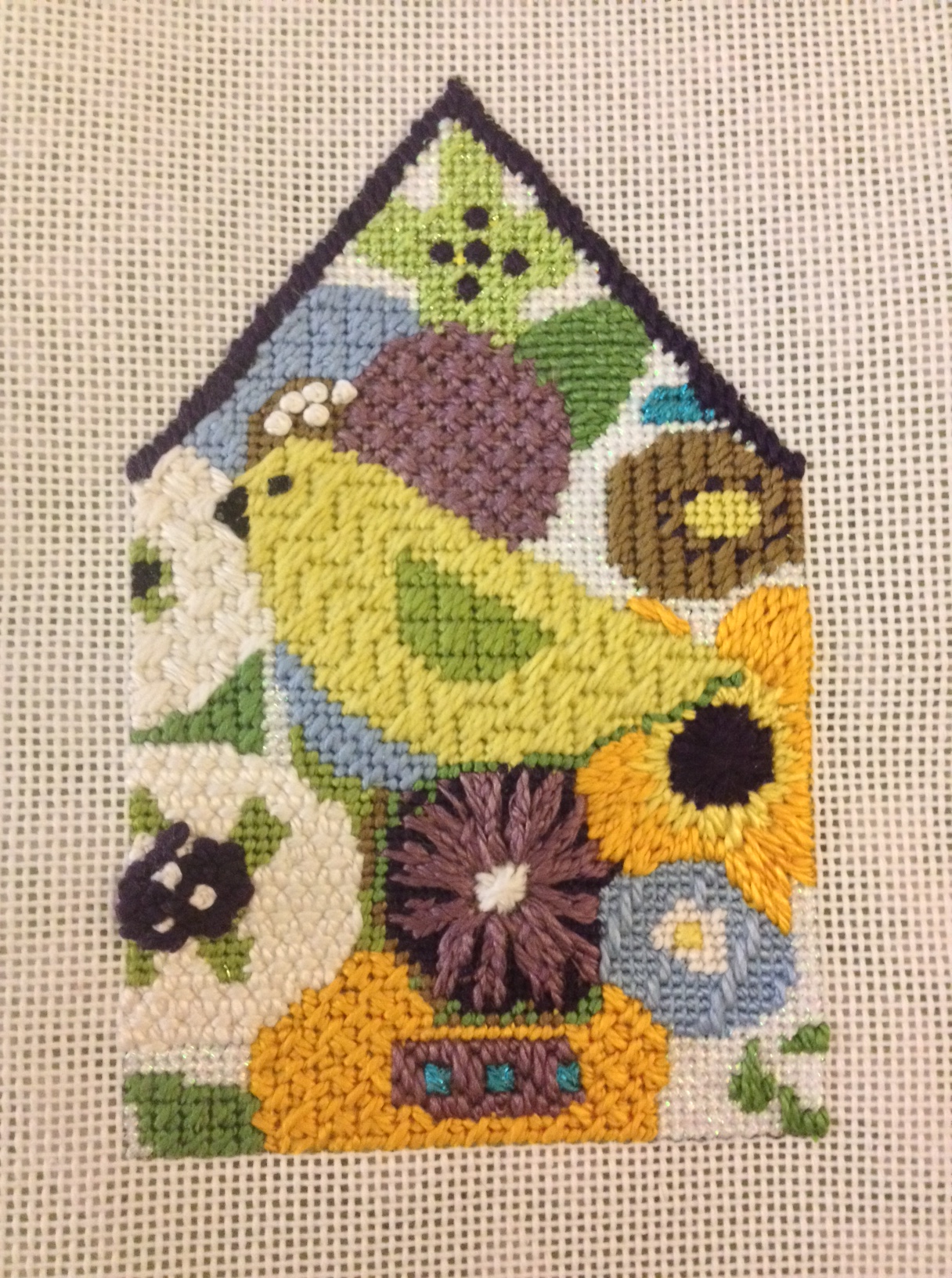 Since the deadline for completing needlepoint Christmas ornaments is ten and a half months away I have slowed down the speed of my production from hyper-fast to just impressive. Without the self-imposed pressure to get just one more canvas done I veered off into creativity mode on this week’s ornament. It is a little bird house with flowers and rather than just do the standard basket weave stitch I decided to do this one like a sampler and do a different decorative stitches on each flower and the bird.