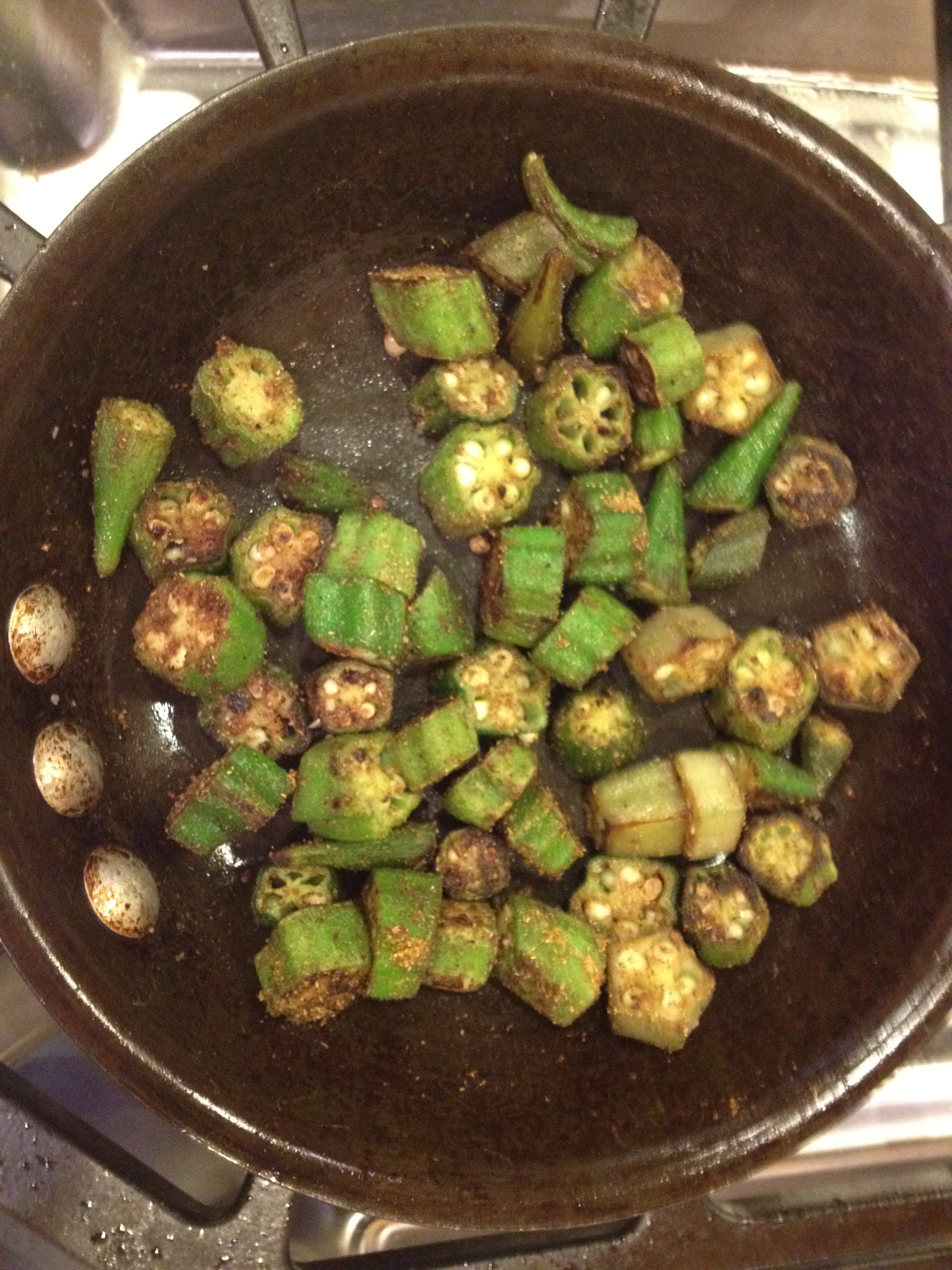 As much fresh Okra as you can get your hands on (It is at the Durham farmer’s Market now through September)