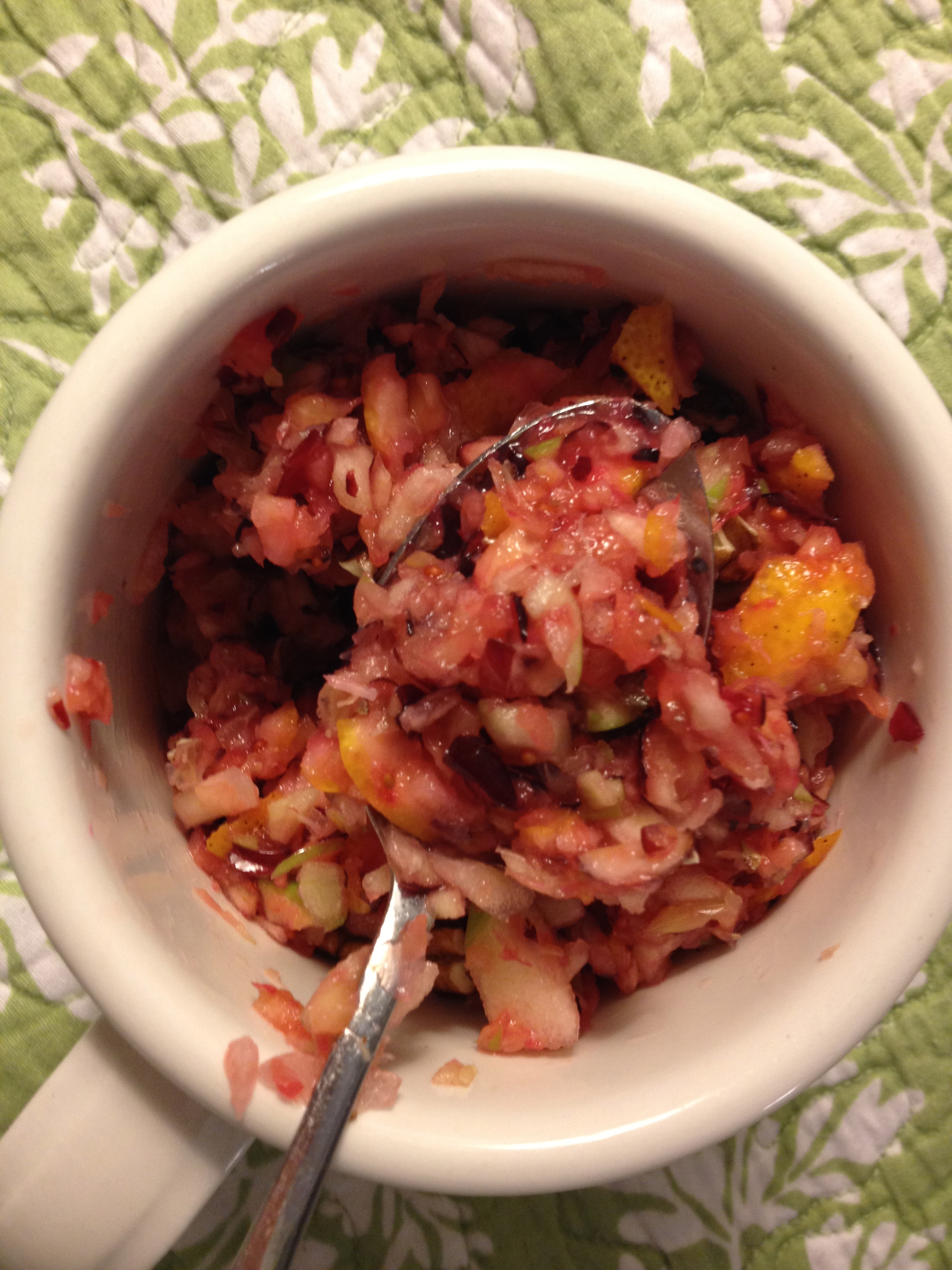 Posted: November 19, 2012 Filed under: Recipes | Tags: apple, cranberries, orange, pecans, pineapple Leave a commentI went to make our Thanksgiving cranberry sauce and had a memory of a raw cranberry/whole orange chopped salad I made last year, but never wrote down how I made it. What a mistake, since my mouth started watering for it even though my brain did not know exactly what was in it.